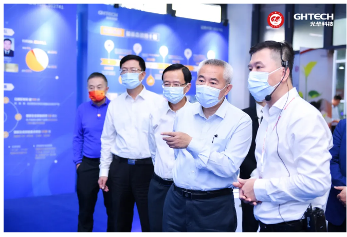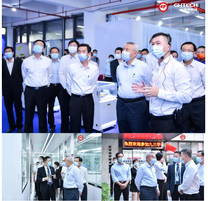 广东省政协副主席、九三学社广东省委员会主委、省住建厅厅长张少康,全国政协委员、九三学社中央秘书长兼组织部部长、监督委员会委员刘晓梅,中共广州市委常委、市委统战部部长、市政协党组副书记王世彤,九三学社广东省委员会专职副主委黄惊雷,九三学社中央监督委员会委员、组织部二级巡视员陈晓英,九三学社中央资源环境专委会副主任、促进技术创新工作委员会副主任陈利浩等领导一同视察调研,九三学社广州市委主委、市科技局局长王桂林,光华科技总裁郑靭等陪同参观。