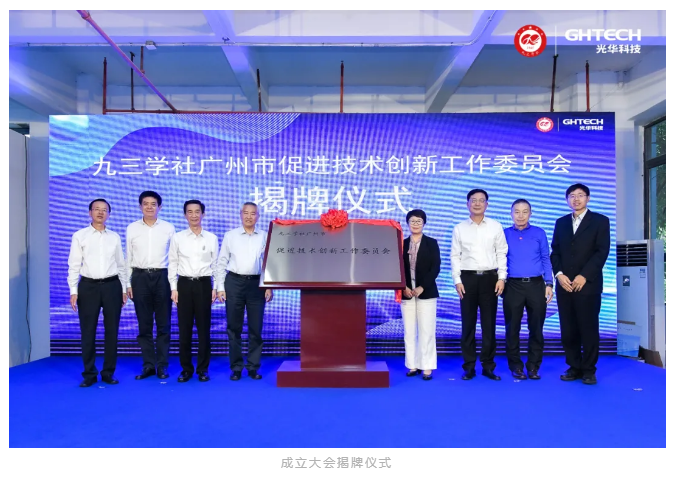 同期,九三学社广州市委员会促进技术创新工作委员会成立大会同步顺利完成。全国政协副主席、九三学社中央常务副主席、监督委员会主任邵鸿,广东省政协副主席、九三学社广东省委员会主委、省住建厅厅长张少康,九三学社中央秘书长兼组织部部长刘晓梅,中共广州市委常委、市委统战部部长、市政协党组副书记王世彤,九三学社广东省委员会专职副主委黄惊雷,九三学社广州市委员会主委、市科技局局长王桂林等领导共同为九三学社广州市促进技术创新工作委员会揭牌,九三学社中央组织部二级巡视员陈晓英,社市委副主委莫伟琼、何江华、马劲轲、贾鹏程、朱伏生出席成立大会。
