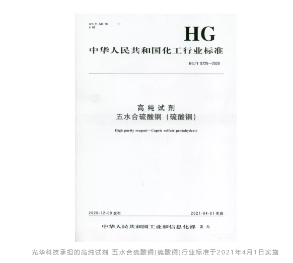 高纯五水合硫酸铜(硫酸铜)主要应用于电子、电镀、军工、医药等行业,如电子行业中,在PCB、LED支架、被动元器件等电镀铜工艺中,作为中间镀层,起导电、防护作用。在这些生产过程中,对硫酸铜的产品纯度、杂质含量控制要求较高,迫切需要制定高于普通化学试剂的高纯试剂标准。基于此,光华科技在2018年提出了高纯试剂 五水合硫酸铜(硫酸铜)行业标准立项申请并获批,该标准已于2019年底报批并于2020年12月9日发布,2021年4月1日实施,标准编号HG/T 5725-2020。