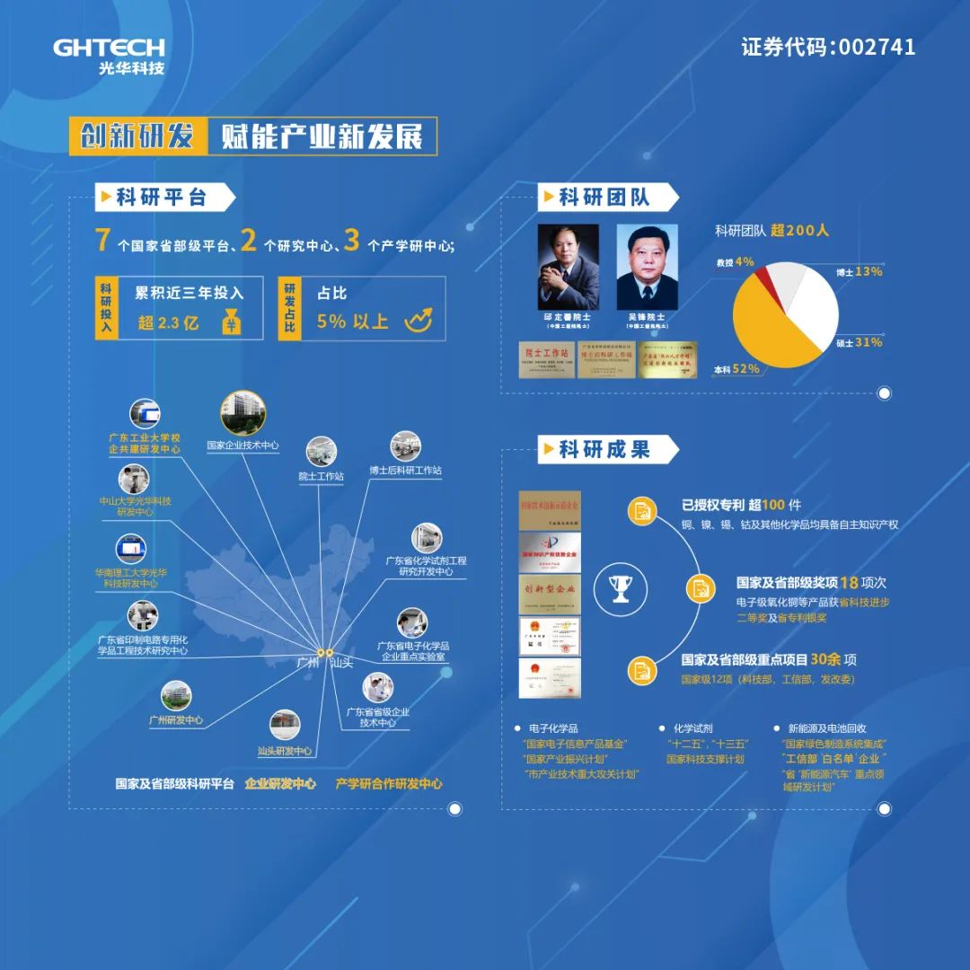 光华科技成立40余年,以研发创新为基石,是国家企业技术中心、国家知识产权优势企业、国家技术创新示范企业、国家高新技术企业和国家级创新型企业,同时是2021年“电子化工材料专业10强”、“中国电子材料50强”、“中国精细化工100强”。