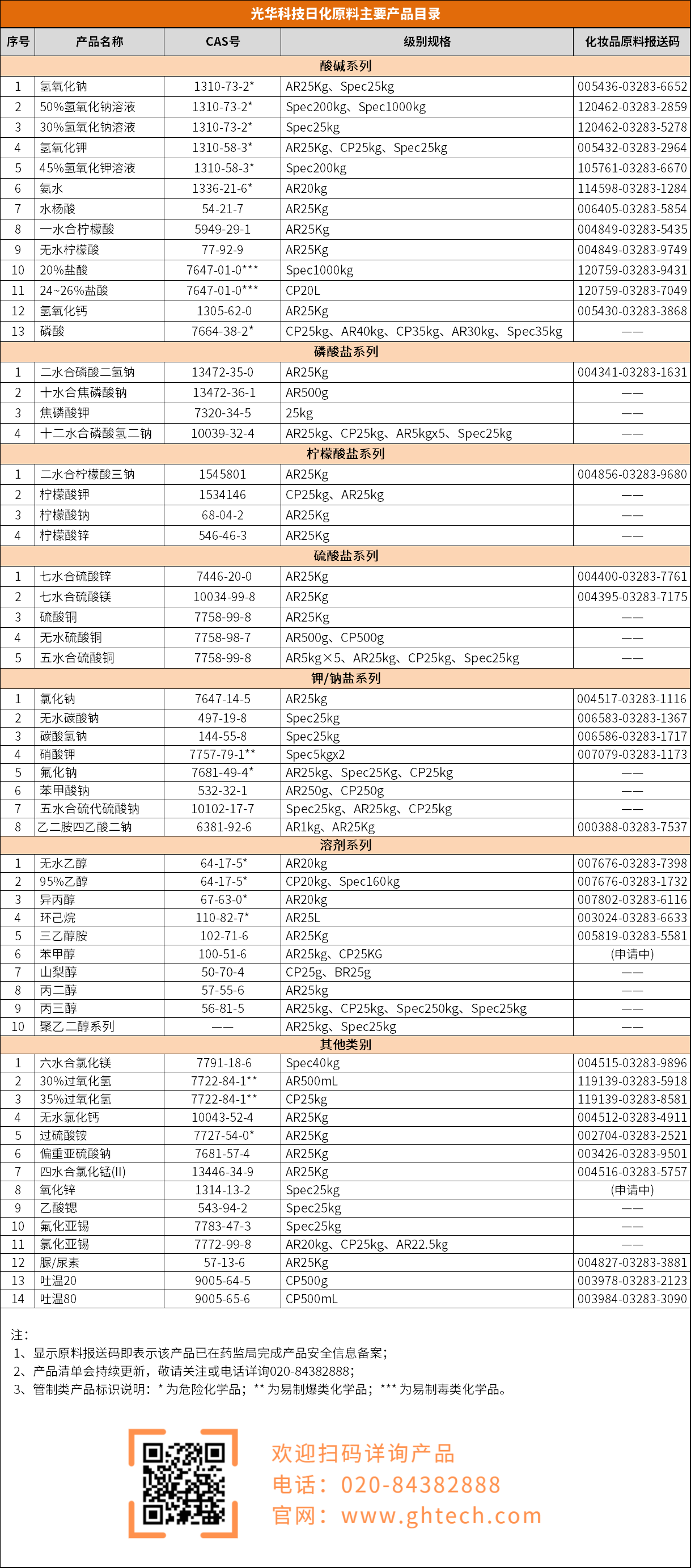 光华科技深耕试剂与专用化学品行业40余载,提供多种功能成分的高品质化学原料生产、研发与销售,保障客户供应链安全,助力高端化学品国产替代。同时,公司与客户合作创新,打造差异化产品,以满足消费者多元、环保的使用需求,实现行业、环境的可持续发展。