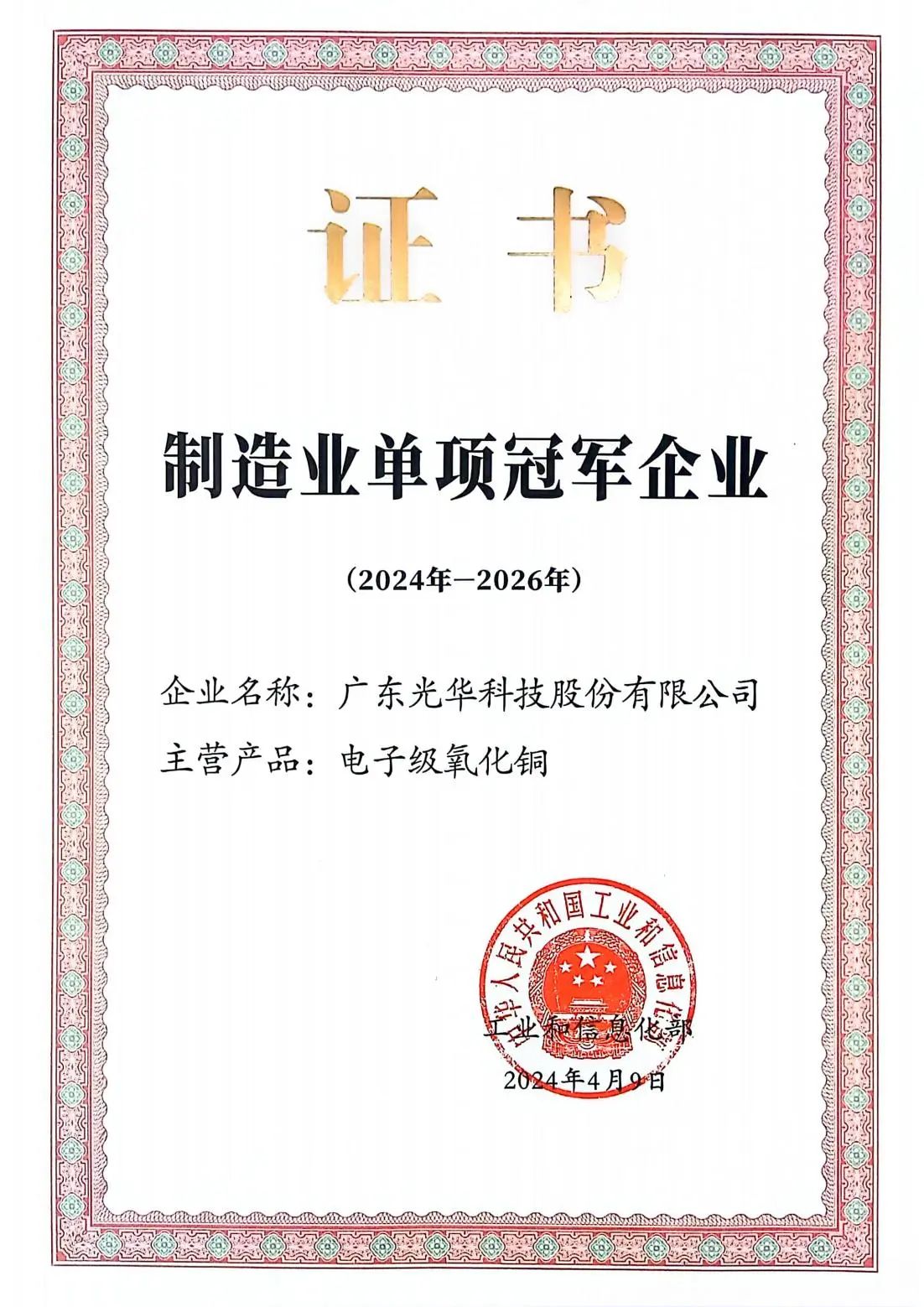 光华科技作为国际化高纯电子级氧化铜的领先供应商,其产品广泛应用于手机、笔记本电脑、汽车及存储设备等高端消费电子产品和通信领域。凭借领先的性能与稳定性,光华科技在半导体封装、IC载板、HDI板、FPC板及SLP等领域占据重要地位,市场占有率超40%,稳居国内首位。2024年4月,光华科技荣膺国家级制造业单项冠军企业称号。