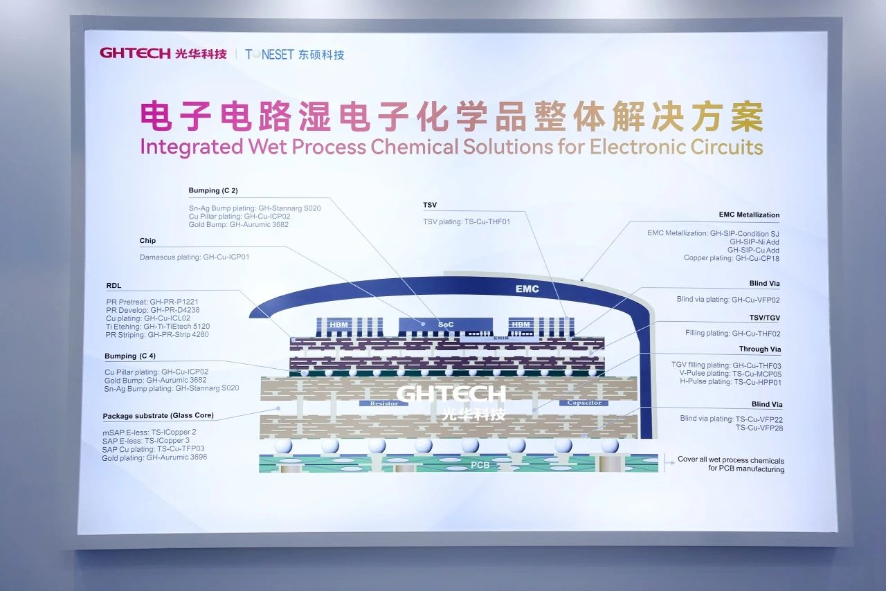 光华科技展台展示了电子电路湿电子化学品的产品布局和整体解决方案,覆盖PCB、IC载板以及半导体先进封装三大领域。吸引了众多专业人士和客户的相继到访,与光华科技销售、技术服务团队展开深入的交流。结合当前AI服务器、数据中心、低空星链、新能源汽车等高端应用场景,光华科技重点推出的高频高速键合剂、填孔通孔镀铜、高可靠低应力沉铜、化锡、镍钯金、玻璃基镀铜、铜柱电镀、无氰镀金等系列产品,其稳定性、高可靠性均受到专家和客户认可。