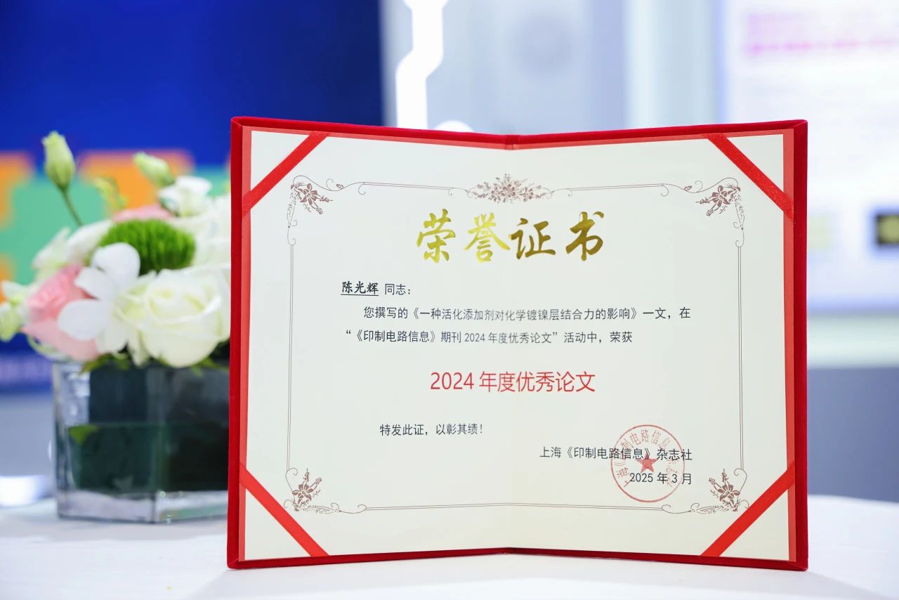 光华科技陈工发表的《一种活化添加剂对化学镀镍层结合力的影响》论文获得了《印制电路信息》期刊的“2024年度优秀论文奖”,彰显了公司在研发领域的技术创新与突破。