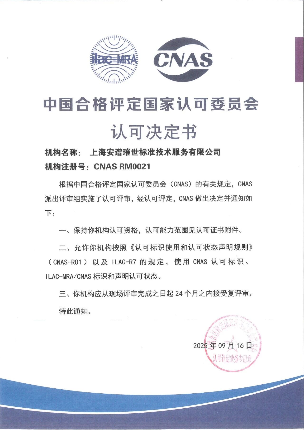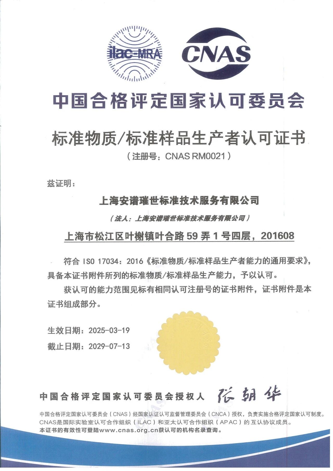 近日,上海安谱璀世标准技术服务有限公司(简称“安谱璀世”),正式收到中国合格评定国家认可委员会(CNAS)的通知:我司标准物质/标准样品生产者(RMP)认可资格成功通过复评审,并获得持续保持。这标志着安谱璀世的标准物质在生产体系、技术能力和质量管理方面再次获得国家权威机构的认可,为我们持续稳定地提供高质量、可溯源的标准物质产品奠定了坚实基础。