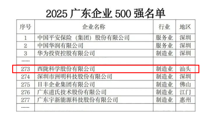 10月29日,广东省企业联合会、广东省企业家协会正式发布《2025广东500强企业发展报告》及“2025广东企业500强”名单。西陇科学凭借卓越的综合实力与稳健的发展表现,再度荣誉登榜,位列第273位,充分彰显了公司在先进制造领域的稳健发展态势。