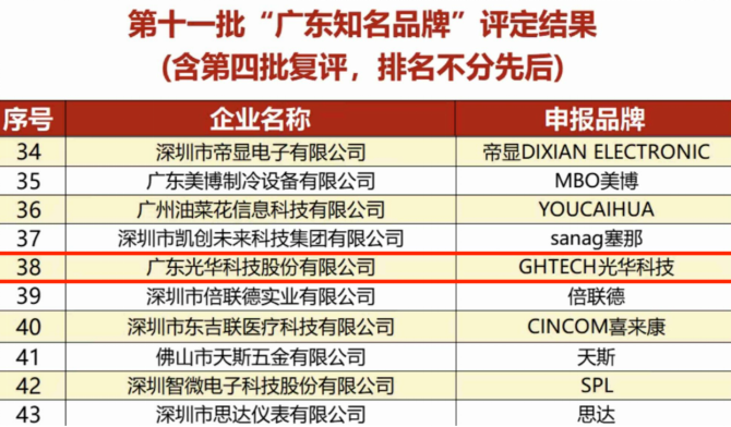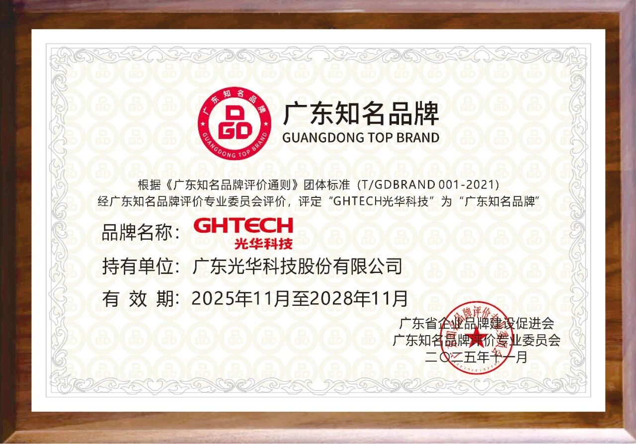 经广东知名品牌评价委员会召开现场及小组评审工作会议,对申请品牌进行了企业申报、资格审查、申报材料核查、实地抽查、行业知名度调研、公开查询、专家评审等一系列环节后,第十一批“广东知名品牌”名单揭晓。本次榜单汇聚了广东各领域的标杆企业,包括Transsion 传音、DONGPENG东鹏、555虎头电池等知名品牌。“GHTECH光华科技”以领先的技术实力、完善的产品体系及优质的客户服务,荣获“广东知名品牌”,彰显了其卓越的品牌实力。