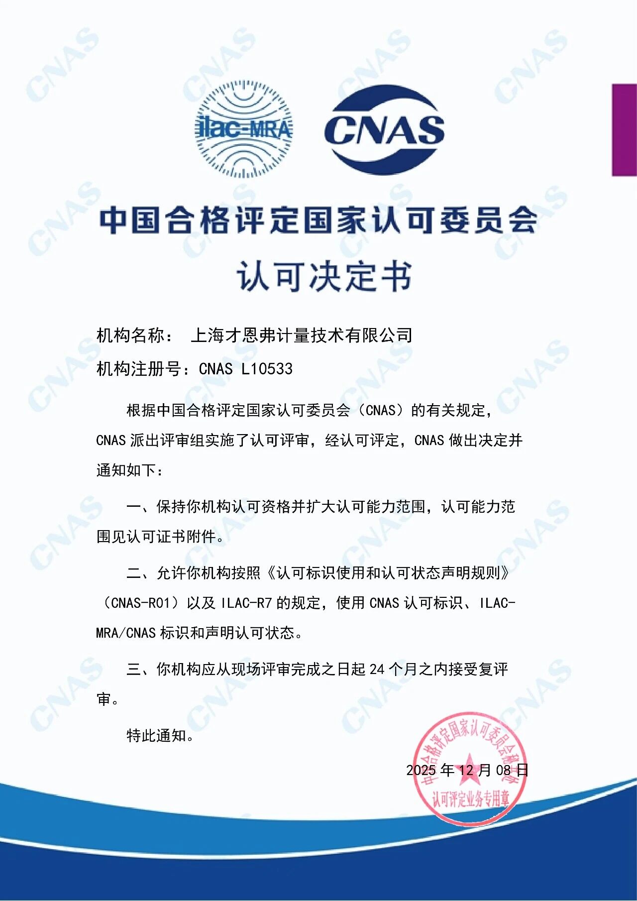 近日,中国合格评定国家认可委员会(CNAS)评审组对上海才恩弗计量技术有限公司(以下简称“才恩弗计量”)开展复评及扩项评审。经严格审查,评审组一致推荐才恩弗计量上报的各项校准参数,标志着其校准服务能力与管理水平再上新台阶,为行业客户提供更可靠的技术支撑。
