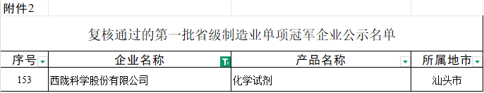 近日,广东省工业和信息化厅正式发布《关于2025年广东省省级制造业单项冠军企业及第一批复核企业名单的公示》,西陇科学凭借在化学试剂全品类领域的持续创新与综合领先优势顺利通过复核,蝉联第一批省级制造业单项冠军企业(化学试剂)!