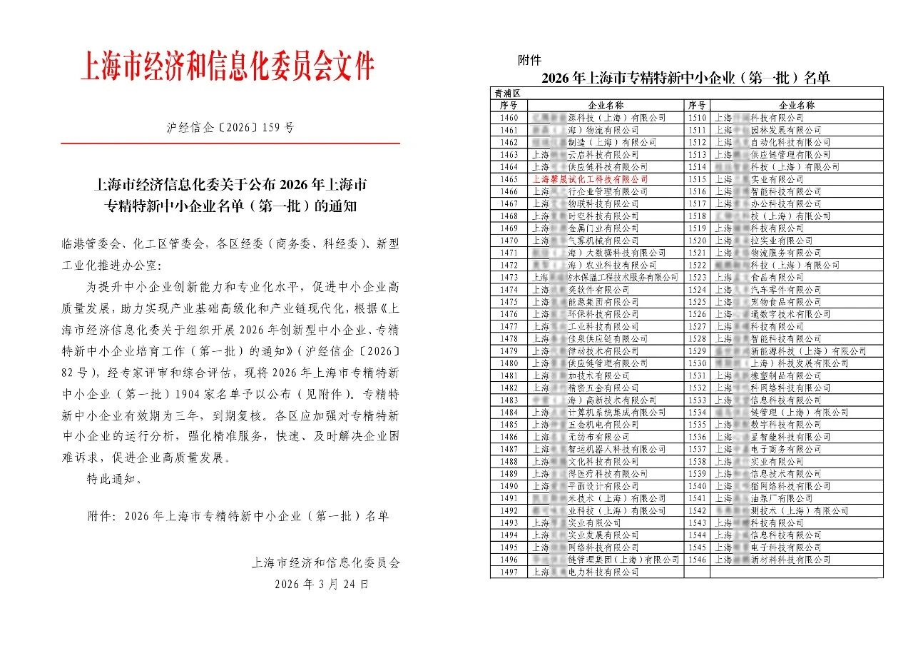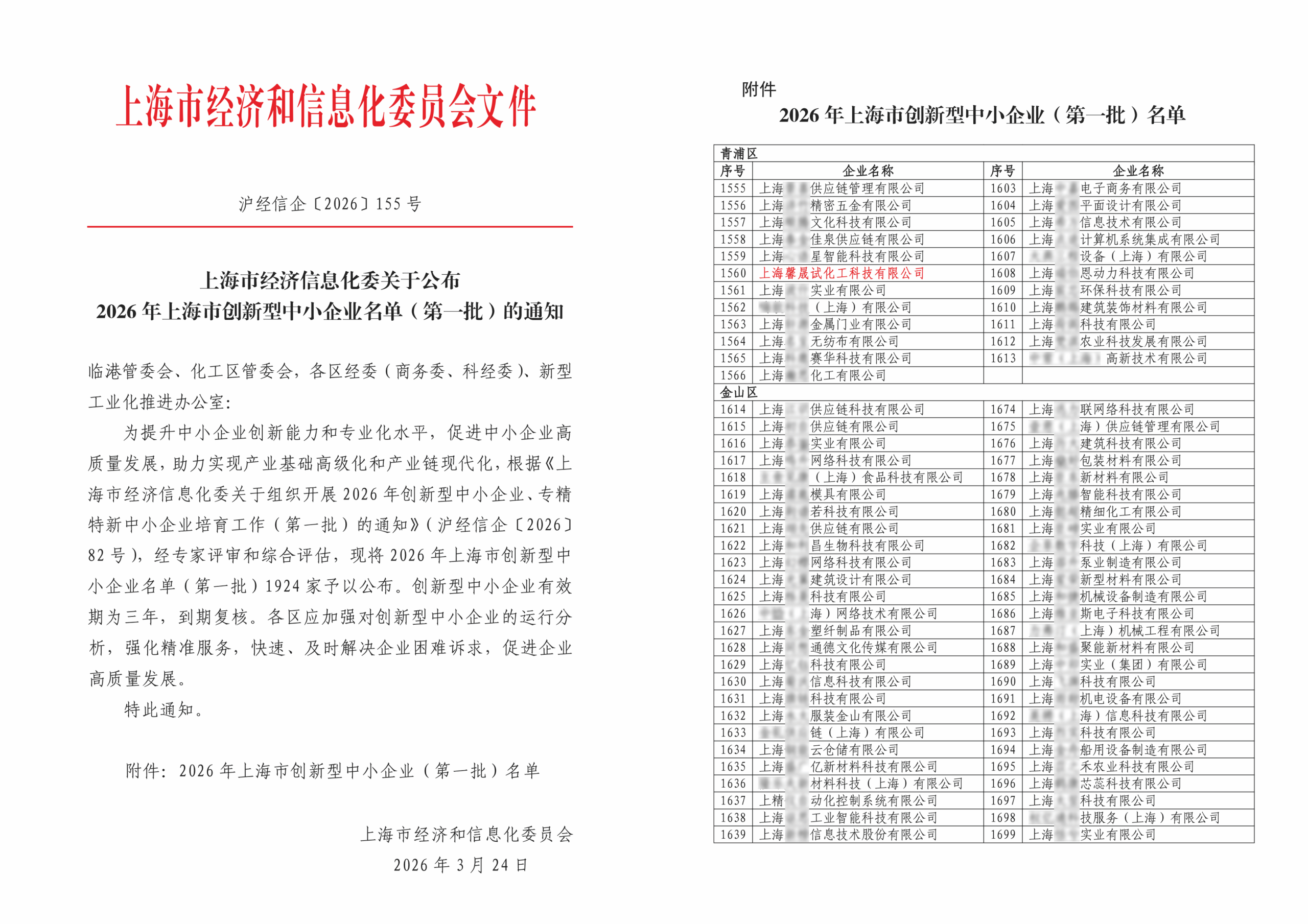 近日,上海馨晟试凭借持续的技术创新、稳健的经营实力与突出的行业竞争力,成功荣获上海市“创新型中小企业”与“专精特新企业”双项认定。
