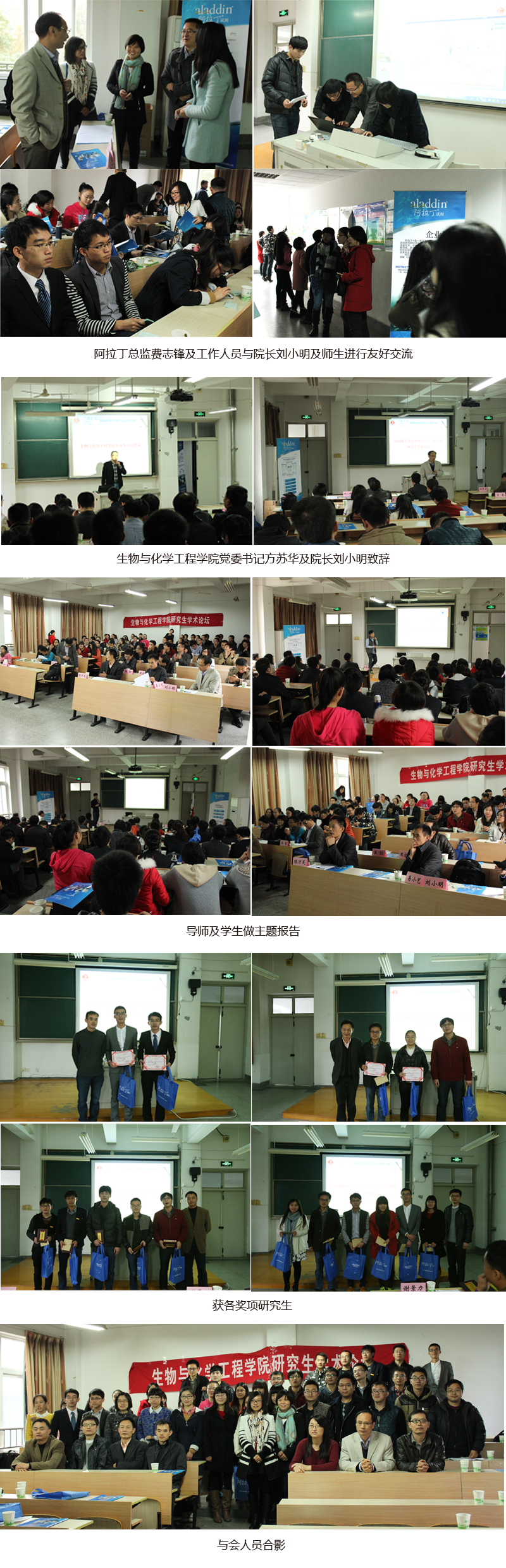 2014年嘉兴学院生物与化学工程学院研究生学术论坛于2014年11月29日在嘉兴学院顺利召开。本次大会邀请了来自中南大学、浙江大学、复旦大学、常州大学、浙师大、昌大等学校的导师及学生前来参加,通过主题报告、邀请报告和口头报告等形式,展示和回顾近年来化学及化工领域取得的新成果和新进展。论坛为广大研究生搭建了一个学术交流及成果展示的平台,对于提高高校的科研水平具有长远的意义。 阿拉丁有幸成为本届论坛的唯一赞助商,并全程协助主办方顺利举行该届论坛。阿拉丁作为一家以电子商务平台为依托,以技术研发为基石的高端试剂生产供应商,长久以来同各个高校都有着良好的合作。阿拉丁也一直致力于为科技进步以及科研事业的发展做出贡献,未来我们也希望能够同更多的高校及科研院所有更加深入的合作,做到同科技接轨,同学术接轨,为广大科研工作者提供最优质的服务!
