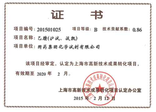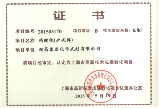 继2013年05月,国药集团化学试剂有限公司独立自主研发的“磷酸二氢钾(沪试牌、沃凯牌)”获得“上海市高新成果转化项目认定办公室”认定后(项目编号:201304238),2015年2月和5月,上海市高新技术培训成果转化项目认定办公室又授予了公司两项高新技术成果转化项目认定证书,分别是上海禾泰自主知识产权的“乙腈(沪试、沃凯)”(项目编号: 201501025) 和“硝酸银(沪试牌)”(项目编号:201503170)。上述三项产品分别获得了上海市“3免2减半”和“5免3减半”税收优惠扶持。