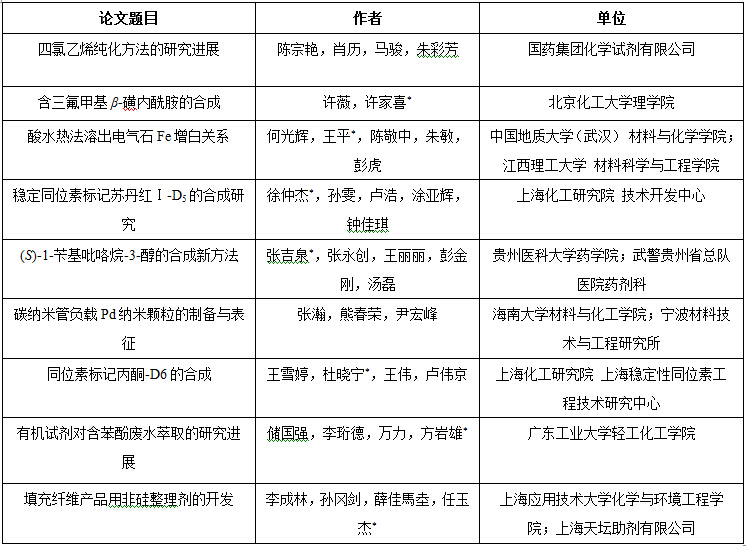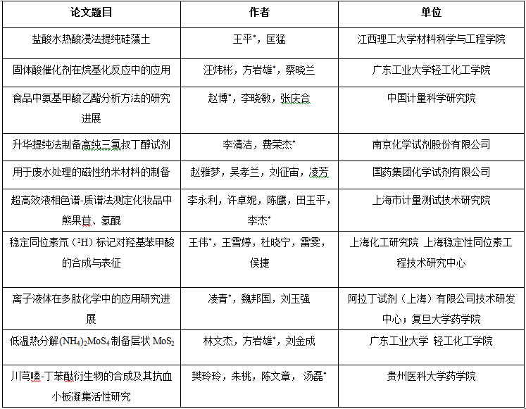 会议主办方向论文获奖作者表示衷心的祝贺,同时希望作者能够尽快完善全文,登录中文核心期刊《化学试剂》官方投稿系统www.chinareagent.com.cn进行在线投稿,将优秀稿件及时分享给大家,获奖文章将优先送审、优先发表,并免审稿费。