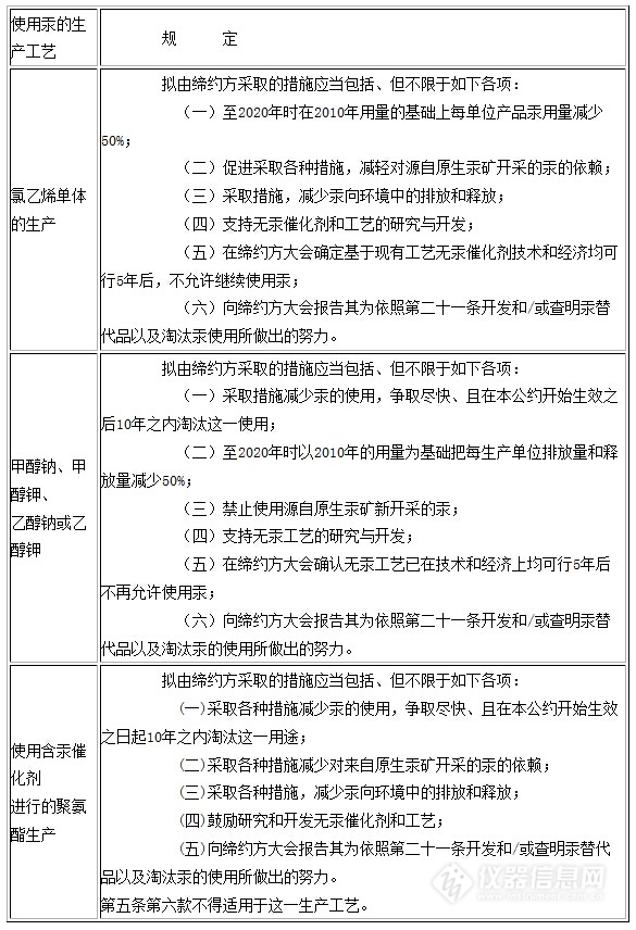 一、就本条文和附件B而言,“使用汞或汞化合物的生产工艺”不得包括使用添汞产品的工艺、添汞产品的生产工艺、以及处理含汞废物的工艺。