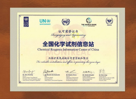 2017年9月12日,在《蒙特利尔议定书》缔结三十周年纪念大会上,全国化学试剂信息总站荣获由联合国开发计划署(UNDP)、联合国环境规划署(UNEP)、联合国工业发展组织(UNIDO)、世界银行(THE WORLD BANK)、环境保护部环境保护对外合作中心(FECO)联合颁发的“认可荣誉证书”。本次获评是对我站工作的肯定,同时也是鞭策,我站将继续承担应尽的履约义务,积极配合履约工作,为消耗臭氧层物质的遏制作出应有的贡献。