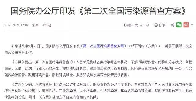 9月21日,国务院办公厅发通知称,将开展第二次全国污染源普查工作,标准时点为2017年12月31日。