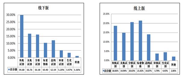 线下版:相比于上年度,常用高纯试剂和环保试剂都有一定提升,提升率分别为3.42%、3.41%。高纯试剂用户的增多,得益于仪器分析、色谱试剂使用量的增加。环保试剂用户的增多,这与国家目前新的发展战略相一致。随着人民生活质量的提高,对环境保护提出了更高的要求,环保分析监测用试剂的品种需求和用量也会增加,为环保试剂的发展提供了有利条件。