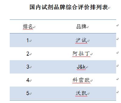 对2017年度收集的国内试剂使用情况调查问卷进行分析可知,国内品牌“沪试”“阿拉丁”“J&K”等在总体评价位列榜首。
