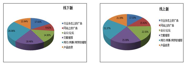 线上版:该用户大部分来自与分析用户,他们更偏向于从专业性的会议或者论坛选择试剂,该部分用户所占比例为22.55%。同时产品目录的宣传对于试剂的选择也较重要,用户可通过目录将企业所生成的试剂进行了解,这样既节省了时间,又相应的寻找到所需试剂。