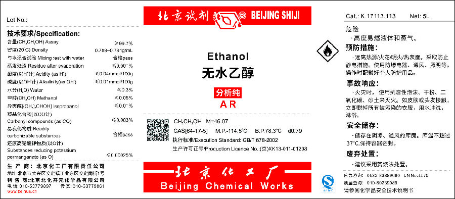 北化产品新标签(以无水乙醇为例)
