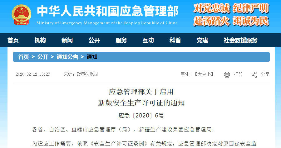 为适应工作需要,依照《安全生产许可证条例》有关规定,应急管理部决定对原国家安全监管局2004年启用的安全生产许可证(以下简称“旧版安全生产许可证”)式样进行调整,重新设计并启用新版安全生产许可证,适用非煤矿矿山、危险化学品、烟花爆竹生产企业的安全生产许可。现将有关事项通知如下: