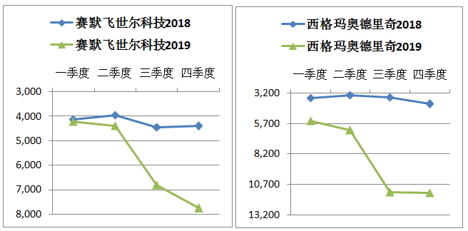 总体表现:对比2019年和2018年的总体表现:波动较大,数据总体下滑;排名顺序变化不大,西陇科学、江苏强盛等企业比2018年下降。