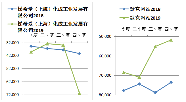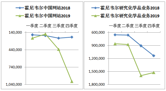 霍尼韦尔中国网站2019年第一、二季度与2018年第一、二季度基本持平,但三、四季度下降明显。霍尼韦尔研究化学品业务排名四个季度2019年比2018年同期均有所下降。
