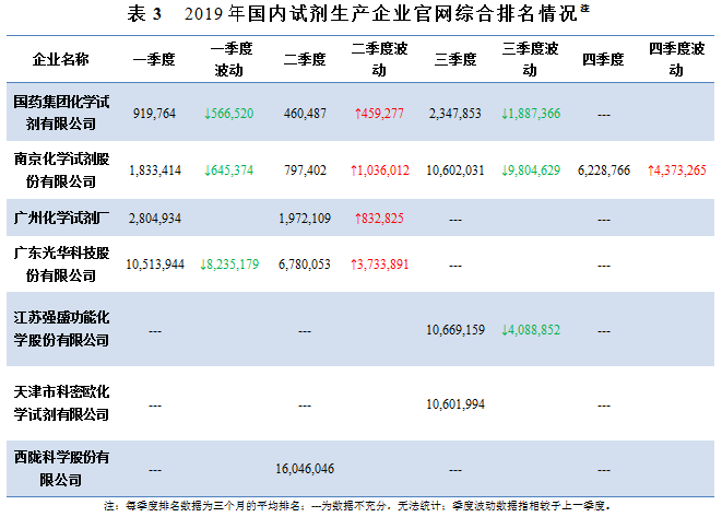 2019年业务波动:从国际试剂企业的电商网站排名来看,第一、二季度较为平稳,第三、四季度除默克网站外有下滑趋势或基本持平;国内试剂企业电商网站的排名第二季度上升明显,第三季度处于平稳运行或下降态势,第四季度有升有降;国内试剂生产企业官方网站第二季度排名整体处于上升态势,第三季度出现下降(详见表1~3)。