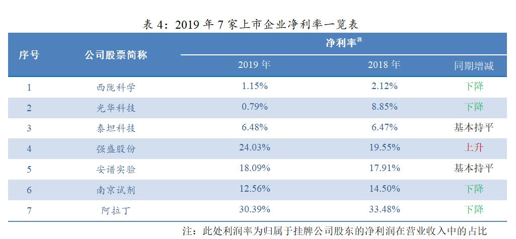 盈利情况:从净利润指标看,2019年7家上市企业的净利润增长率均值为-5.23%,低于2018年均值(37.6%)40个百分点,该报告期内,归属于挂牌股东的净利润均值较去年同期出现了大幅度下降。除西陇科学、光华科技外,其他5家企业净利润均实现不同程度的增长。此外,对比2018年数据显示,除南京试剂2019年净利润增长率高于2018年,由8.87%增长至17.95%,其他6家增长率增幅均放缓。