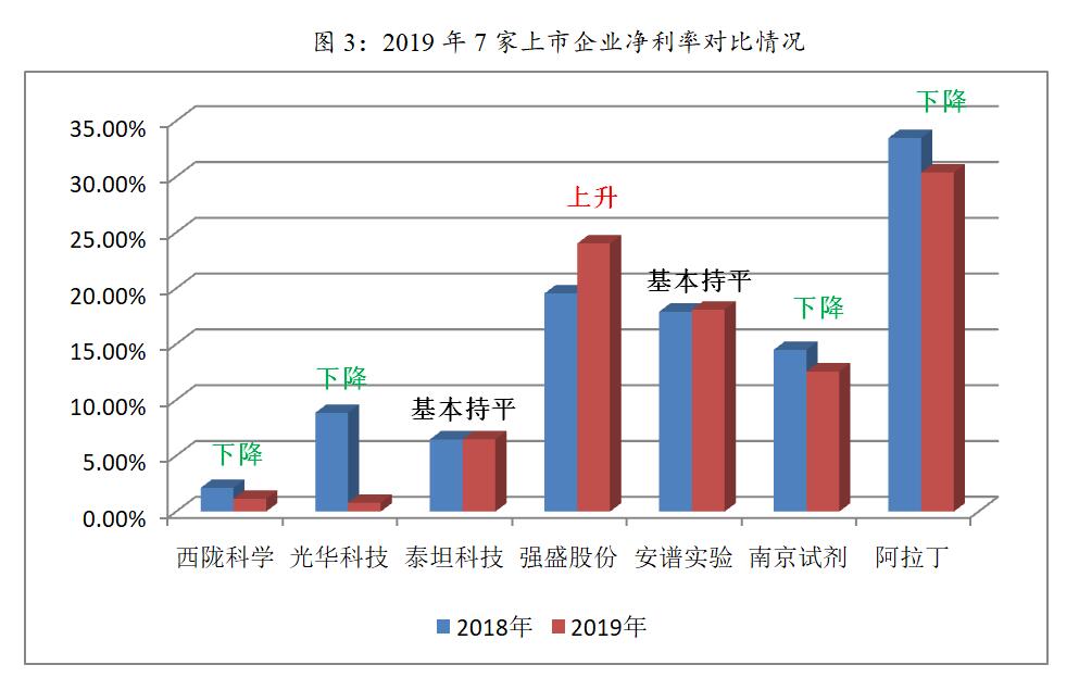 营业收入情况数据一览及对比情况详见表2和图1。其中,营业收入最高的是西陇科学,达到33.4亿元,但比去年同期下降0.52%。营收增幅最大的是南京试剂,比去年同期增长36.19%,增幅较2018年同期(15.43%)扩大,保持良好的增长态势。据其年报披露,主要系加大药用辅料及研发投入,供应链管理得到进一步改善,同时推动技术升级和产品结构优化,增强品牌影响力,优化车间生产工艺和生产模式,利用大数据提高效率、降低成本,促进了公司的整体经营状况。