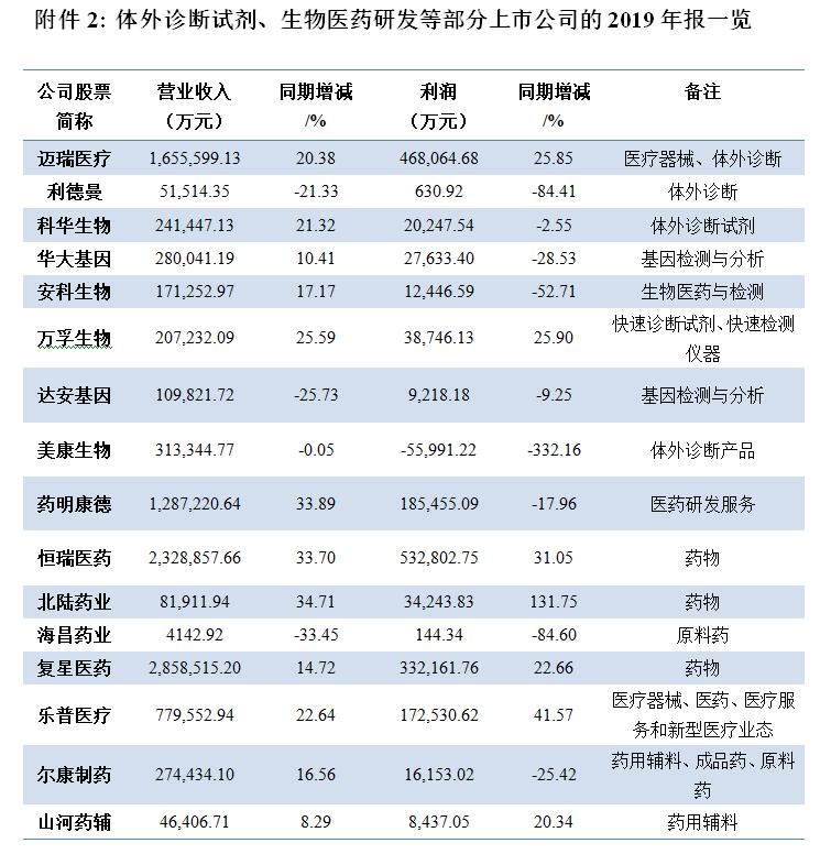 据报道:截止到2020年4月30号,国内IVD相关上市企业已经披露了其2019年报, 29家IVD相关上市企业2019年总营业收入达到760.87亿元,平均为26.24亿元。其中迈瑞医疗以165.56亿元领跑众多企业,迪安诊断、乐普医疗、润达医疗、金域医学表现也很抢眼,均达到了50亿元以上。净利润方面,总额达到了142.99亿元,平均为5.11亿元,创下历史新高。