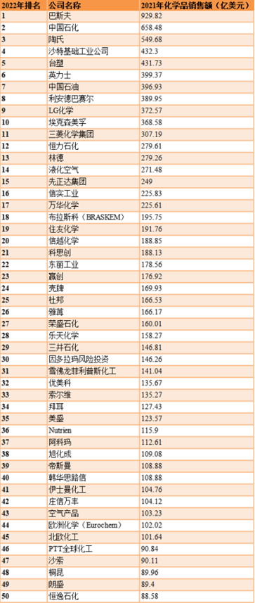 2022全球化工企业50强