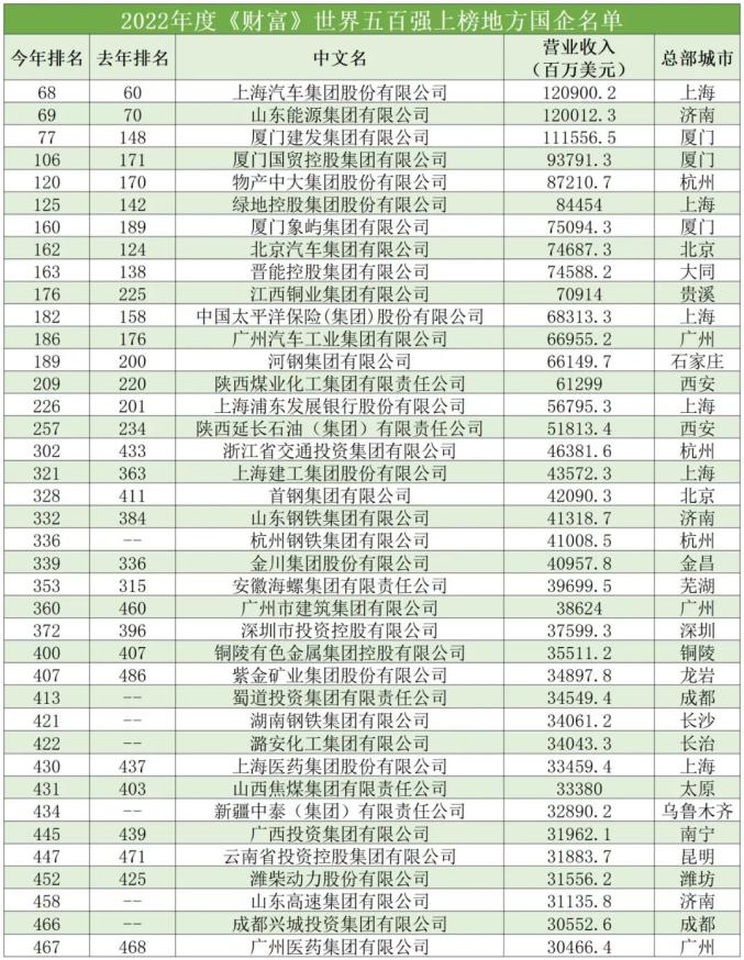 去年上榜的地方国企中,来自山西的华阳新材料落榜,同样来自山西的潞安化工上榜。潞安化工的前身为山西潞安矿业集团,曾连续8次上榜世界五百强。去年首次上榜的紫金矿业排名前进明显,由第486名进步到了第407名。