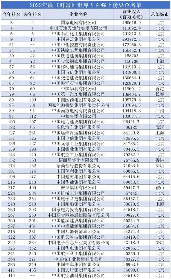 8月3日,2022年《财富》世界500强排行榜发布,145家中国公司上榜(含我国台湾地区企业)。经梳理,今年共有99家国有企业上榜,较去年增加3家,其中:国务院国资委监管的央企(含招商局集团旗下的招商银行)47家;地方国资委监管的地方国企39家,较上年增加6家;财政部监管的金融等企业12家,另有福建的兴业银行再次上榜。《国资报告》独家解析2022年度《财富》世界五百强上榜国企名单,小新为您全文分享—— 北京时间2022年8月3日,《财富》杂志在其 APP发布最新《财富》世界500强排行榜。加上我国台湾地区企业,我国共有145家公司上榜,比上一年增加2家,上榜数量连续第四年位居各国之首。今年,美国共计124家公司上榜,比上一年增加2家。