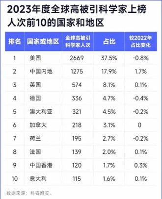 中国内地今年继续排名第二,共有1275人次入选,所占比例从2018年的7.9%上升至17.9%。五年来,中国内地科学家在全球高被引科学家中所占比例翻了一番多,这反映了科研全球化正推动高层次科研和学术贡献实现重要的全球发展再平衡。