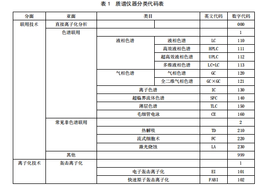 根据质谱仪器联用技术分为直接离子化分析、色谱联用以及常用非色谱联用三个亚面。根据不同的色谱类型分为液相色谱、气相色谱、离子色谱、薄层色谱、超临界流体色谱、毛细管电泳 6 个类目;各类目再根据该色谱原理不同,再逐一划分。常用非色谱联用分为热解吸、流式细胞术、激光烧蚀 3 个类目。