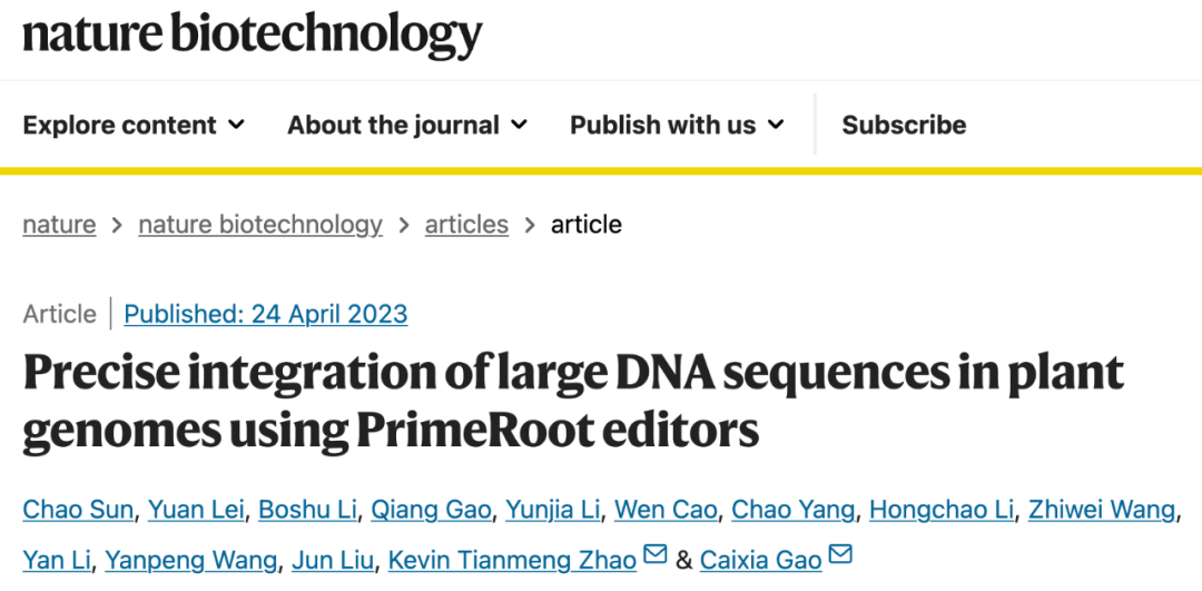 2023年4月,高彩霞研究员团队在Nature Biotechnolgy期刊发表了题为Precise integration of large DNA sequences in plant genomes using PrimeRoot editors的研究论文。