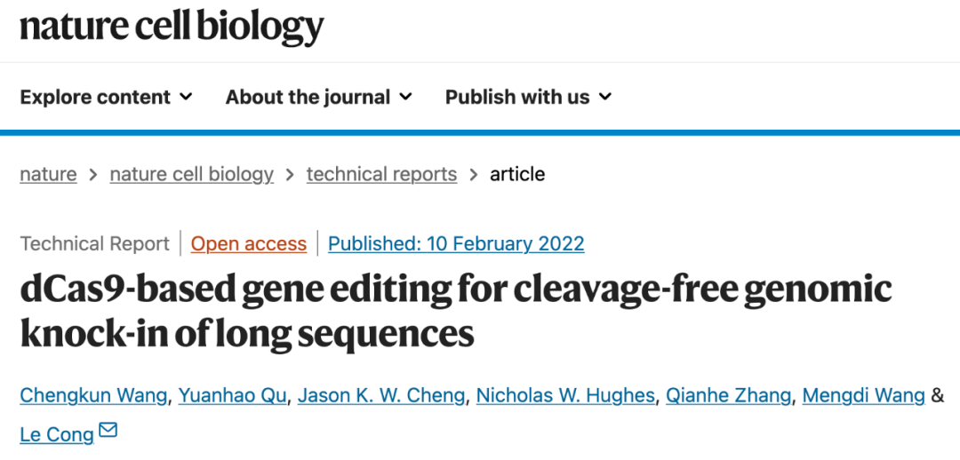 2022年2月,斯坦福大学丛乐团队在Nature Cell Biology期刊发表了题为dCas9-based gene editing for cleavage-free genomic knock-in of long sequences的研究论文。