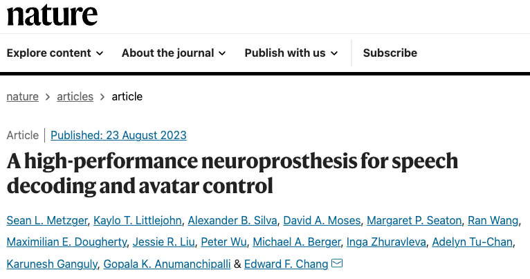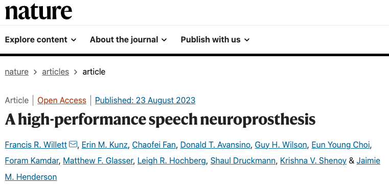 2023年8月,Francis Willett团队将这项研究以A high-performance speech neuroprosthesis为题,发表在了Nature期刊。