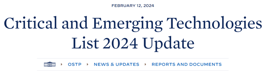 2024年2月12日,美国国家科学技术委员会(NSTC)发布了新一版关键和新兴技术(Critical and emerging technologies, CETs)清单。CETs清单以美国2020年发布的《关键和新兴技术国家战略》为基础,每两年更新一次关键和新兴技术领域列表,及各领域内的具体技术清单。