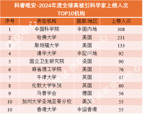 在全球高被引科学家上榜人次TOP10机构中,中国科学院以308人次位居全球榜首;哈佛大学以231人次位居第二;斯坦福大学以133人次位居第三。紧随其后的是清华大学,较2023年上升一个位次,国立卫生研究院(美国)则以90人次排在第五位。