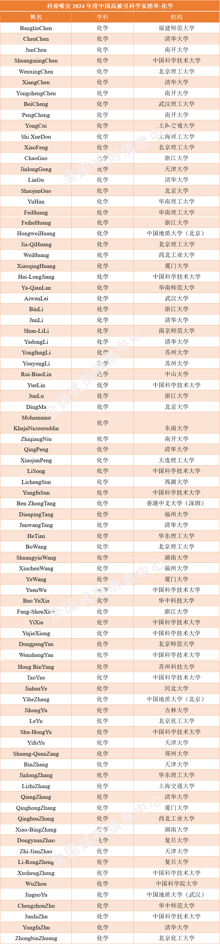 下面是2024“中国高被引学者” 榜单化学学科上榜学者名单,仅供大家参考。