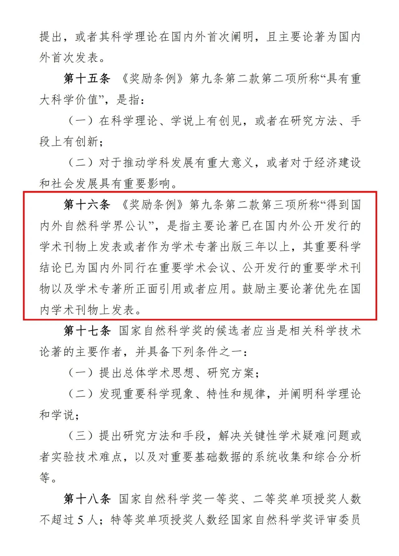 第十六条 《奖励条例》第九条第二款第三项所称“得到国内外自然科学界公认”,是指主要论著已在国内外公开发行的学术刊物上发表或者作为学术专著出版三年以上,其重要科学结论已为国内外同行在重要学术会议、公开发行的重要学术刊物以及学术专著所正面引用或者应用。鼓励主要论著优先在国内学术刊物上发表。