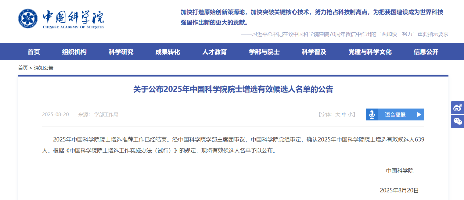 2025年中国科学院院士增选推荐工已经结束。经中国科学院学部主席团审议,中国科学院党组审定,确认2025年中国科学院院士增选有效候选人639人。根据《中国科学院院士增选工作实施办法(试行)》的规定,现将有效候选人名单予以公布。