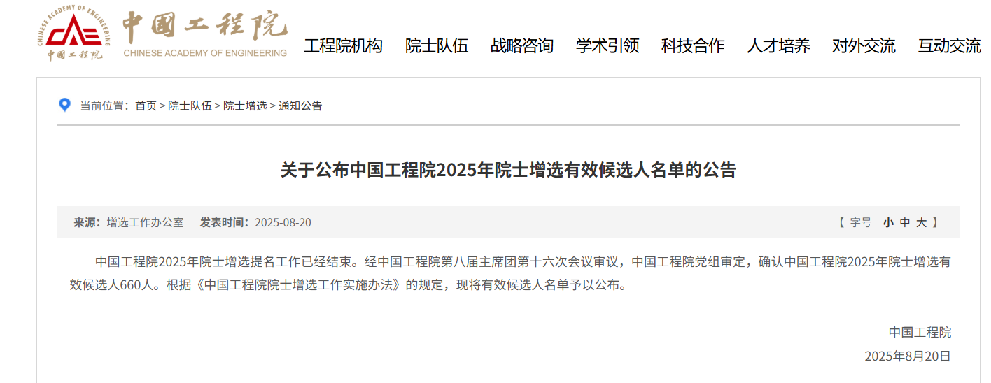 关于公布中国工程院2025年院士增选有效候选人名单的公告