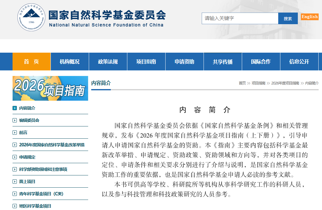 1月19日,国家自然科学基金委员会网站发布2026年度项目指南。指南显示,2026年,国家自然科学基金推出7项改革举措。《指南》主要内容包括科学基金最新改革举措、申请规定、资助政策、资助领域和方向等,并对各类项目的定位、申请条件和相关要求分别进行了介绍与说明,是国家自然科学基金资助工作的重要依据,也是国家自然科学基金申请人必读的参考文献。