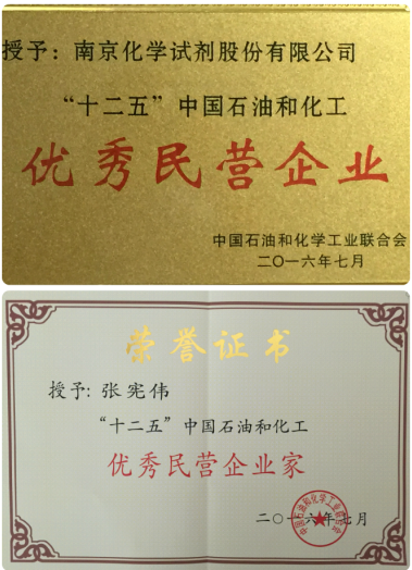 7月2日上午,“2016中国石油和化工民营企业发展大会”在北京隆重召开,会上宣读了《关于表彰“十二五”中国石油和化工优秀民营企业、“十二五”中国石油和化工优秀民营企业家的决定》,南京化学试剂股份有限公司及张宪伟董事长分别获得该荣誉。