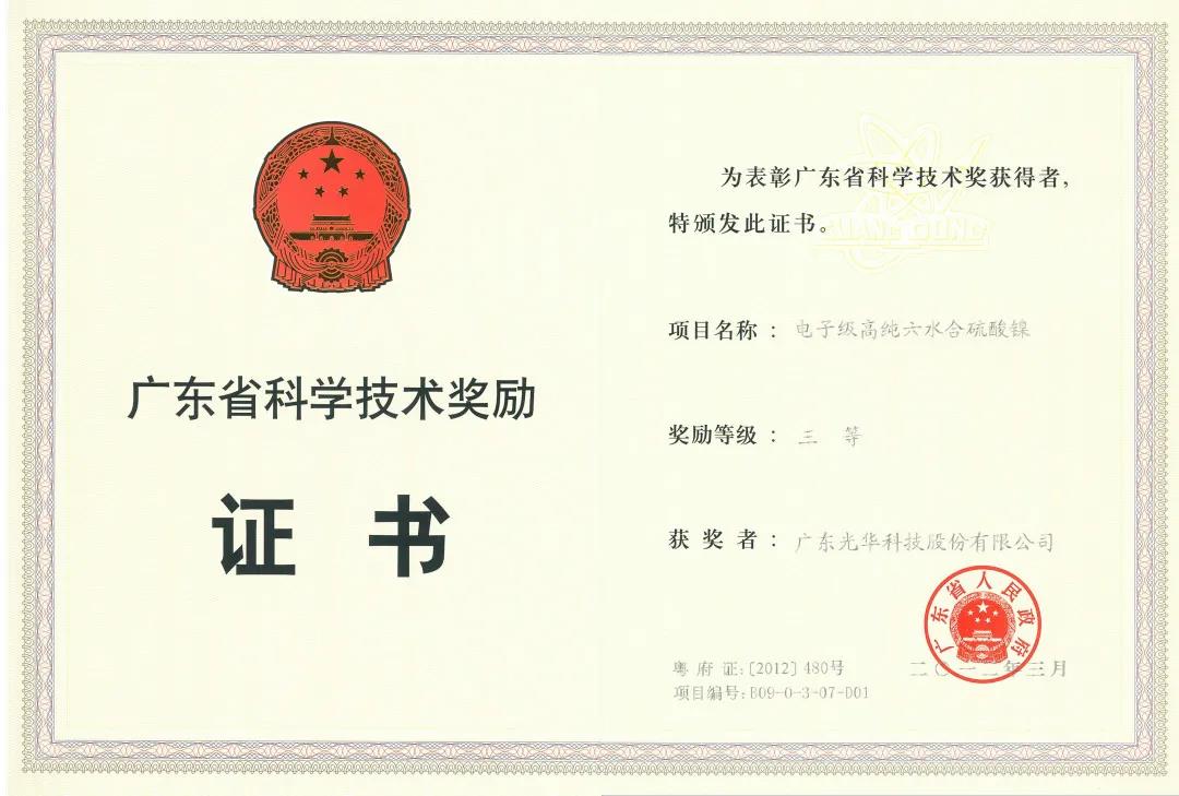 电子级高纯硫酸镍项目获“广东省科学技术奖励三等奖”