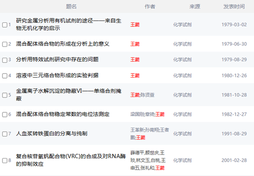 王夔先生与《化学试剂》期刊的深厚渊源跨越半个世纪,其卓越贡献贯穿期刊发展的各个关键阶段。王夔先生自1979年《化学试剂》创刊伊始便参与指导期刊建设,在《化学试剂》期刊发表了多篇高水平学术论文,为期刊奠定了专业基调。
