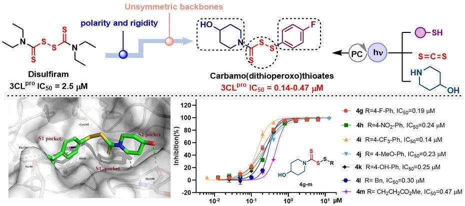 2.Structure-guided design and photochemical synthesis of new carbamo(dithioperoxo)thioates with improved potencies to SARS-CoV-2 3CLpro.Bioorganic & Medicinal Chemistry, 2024, 114, 11790.
